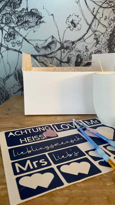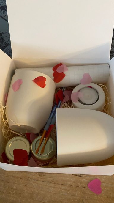 Wir bieten euch eine schön gestaltete Geschenkbox bestehend aus 2 Tassen Momo und einem Teelicht Thea und das was Ihr braucht um die Tassen zuhause individuell zu gestalten.