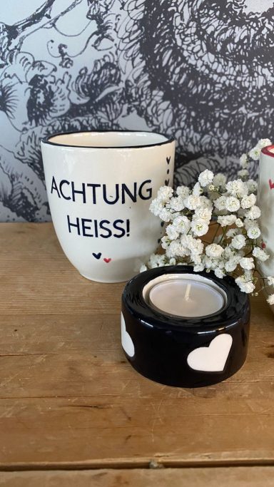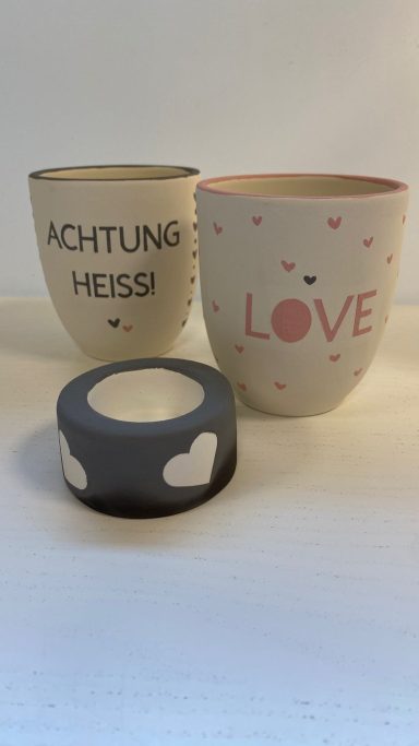 - Ihr könnt gemütlich zu Hause die Tassen und das Teelicht individuell bemalen