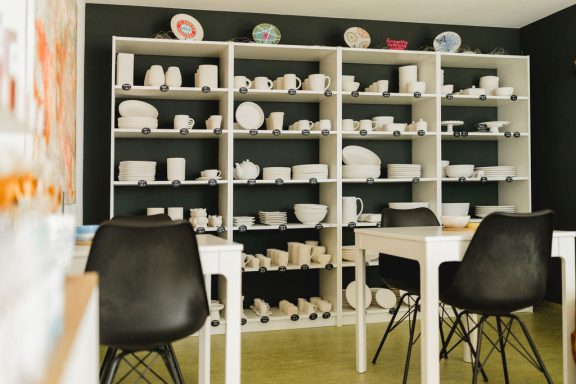 Gute Idee, Keramik bemalen: Neben vielen verschiedenen Musterkeramiken, Stempeln und Aufklebern, findest Du viele weitere Inspirationen und Materialien an unserer großen Farbbar. Natürlich stehen wir Dir immer helfend zur Seite.